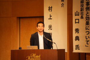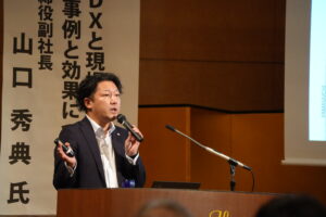 特別講演では、DXの取組事例として、「付加価値ファーストの製造業のDX戦略:旭鉄工/iSTCの挑戦とデータドリブン経営」と題し、i Smart Technologies(株)COO松下 隼人 氏(本校OB)に、「建設業における社内DXと現場DXの取り組み事例と効果について」と題し、ヤマグチ(株)代表取締役副社長山口 秀典 氏にご講演いただきました。